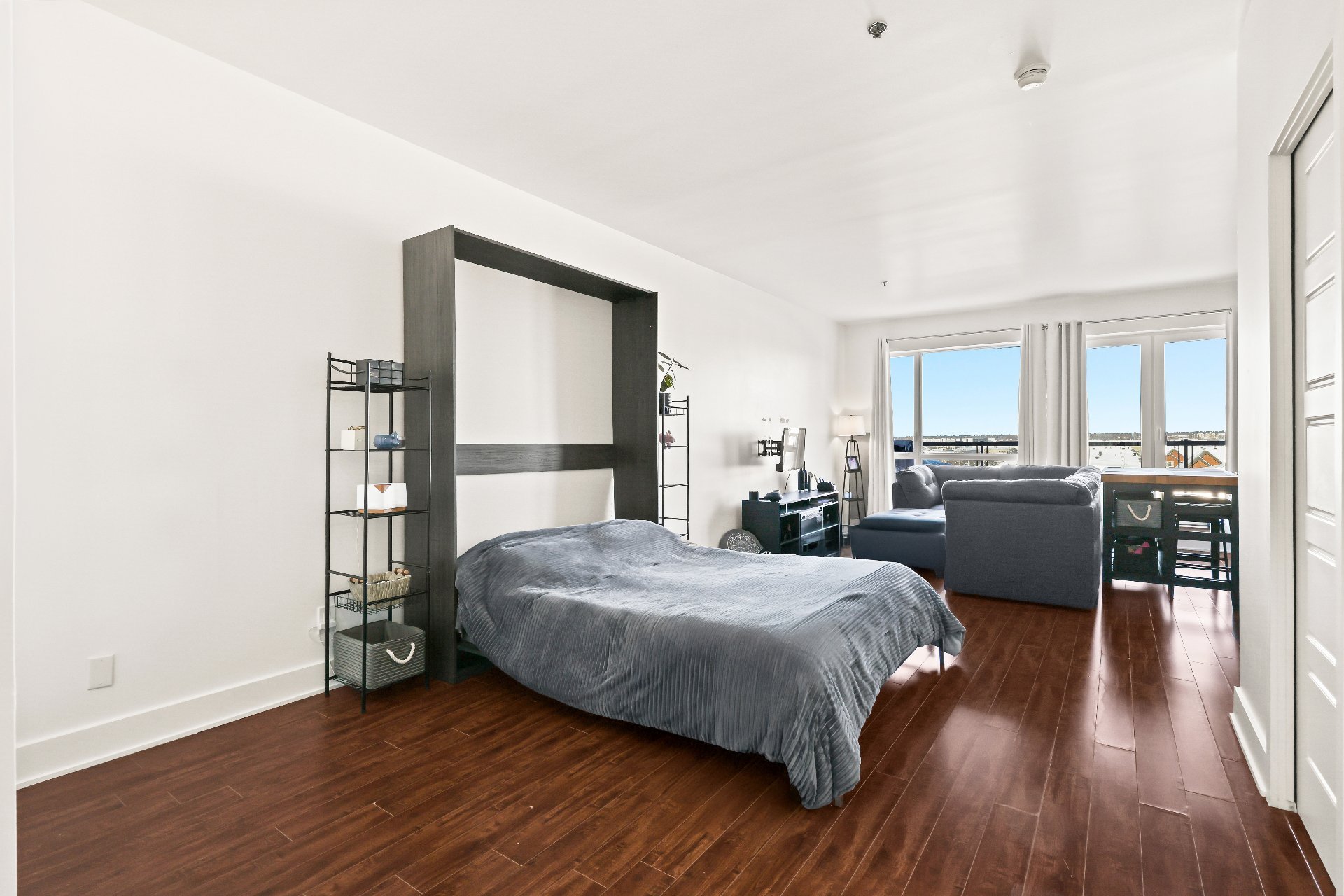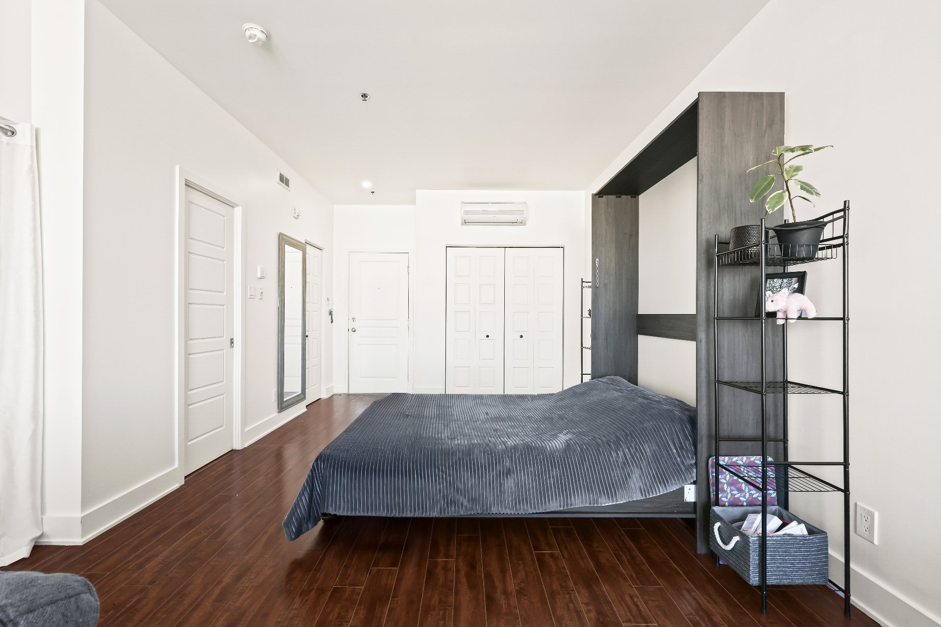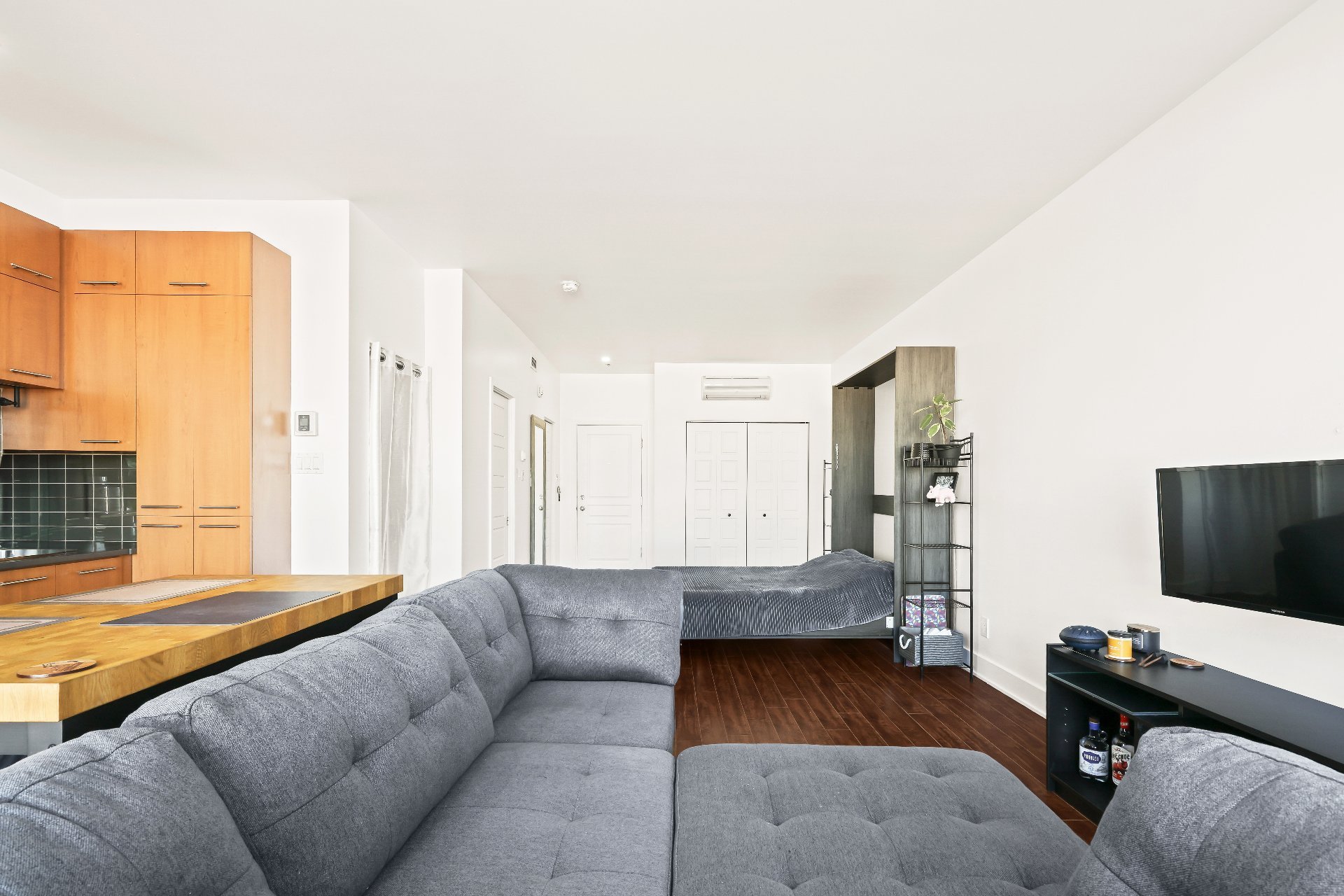 | Murphy bed / kitchen island table with two chairs / IKEA furniture in the walk-in closet / rubber flooring on the balcony / curtain rods and curtains | |