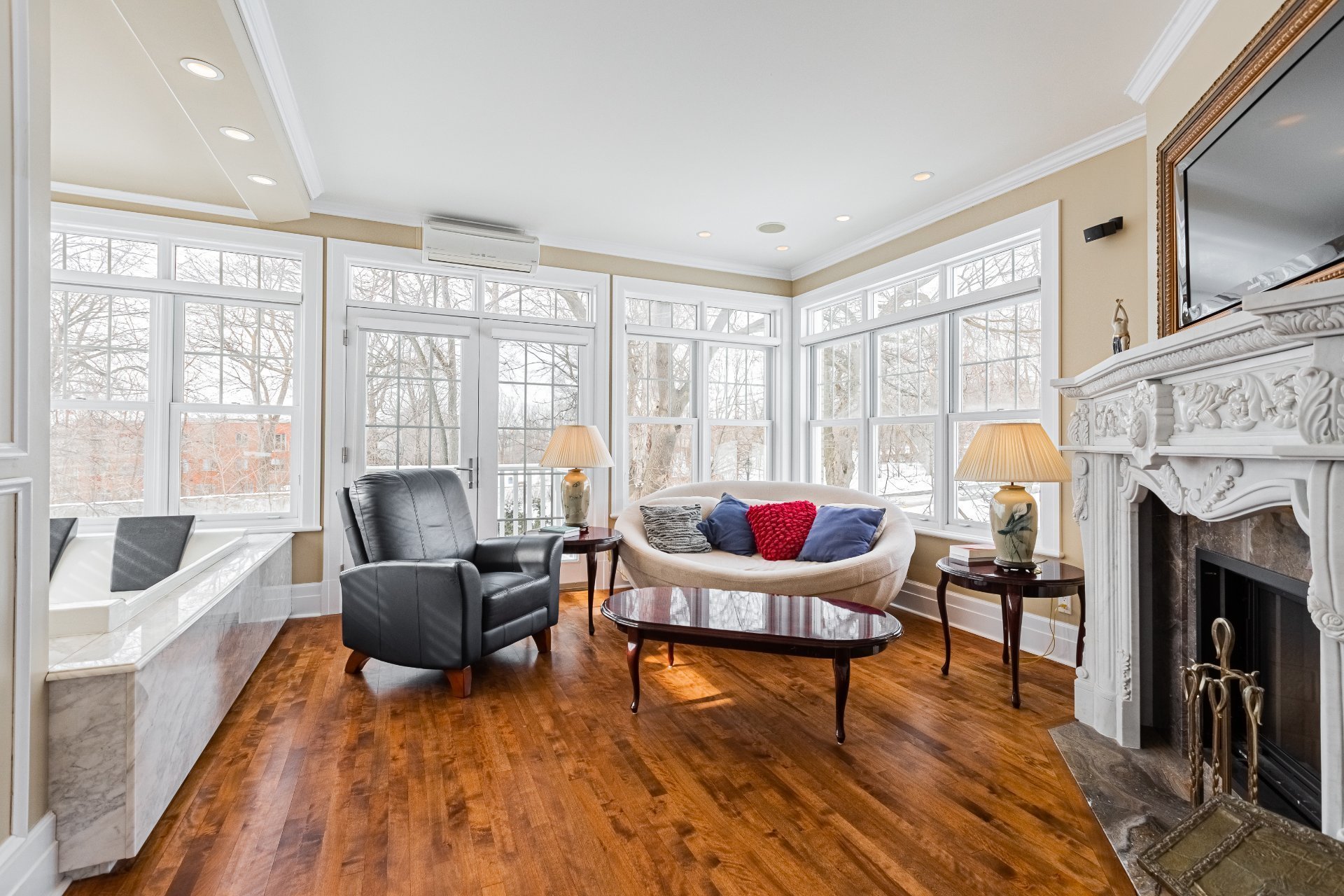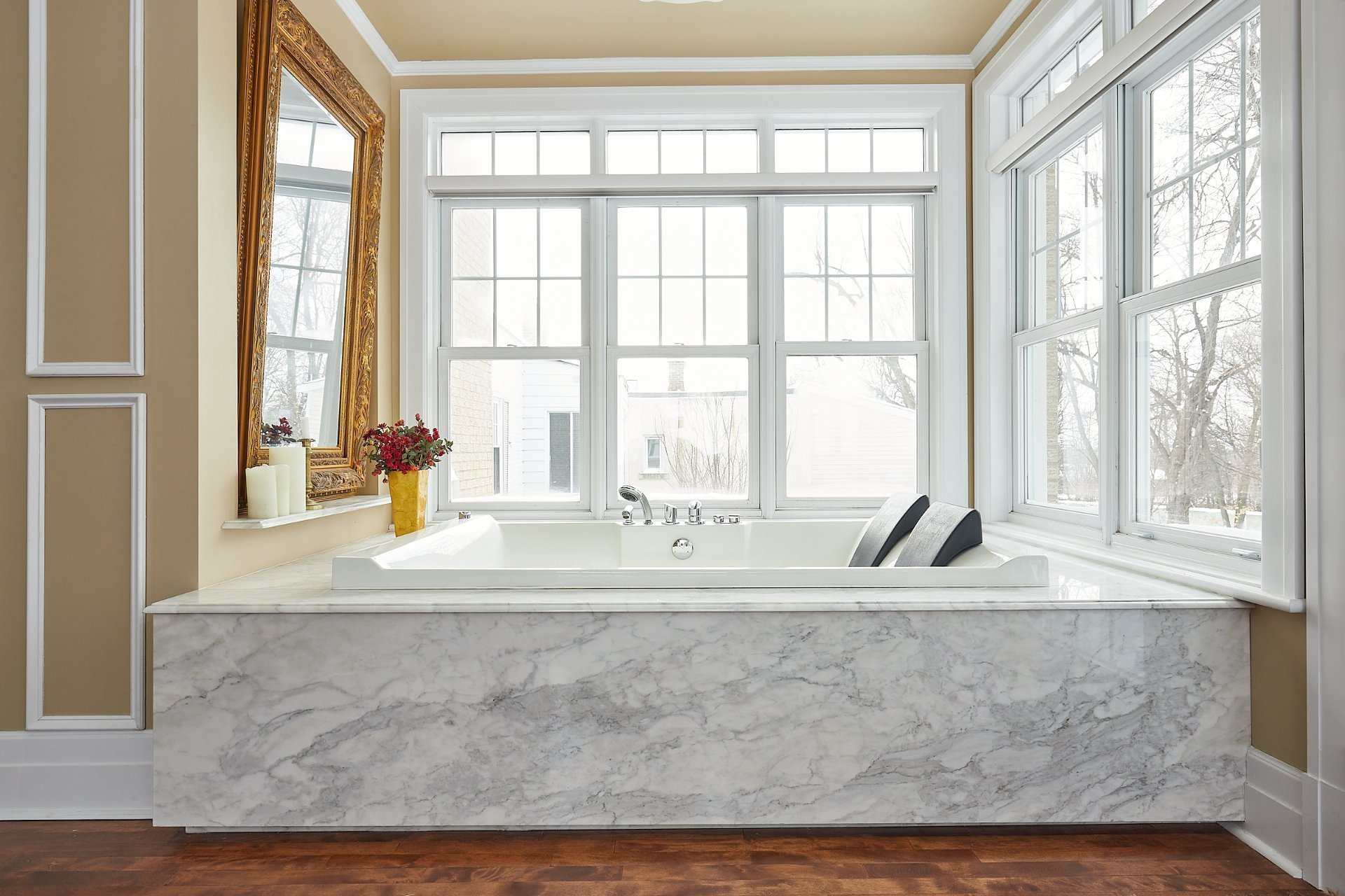 large whirlpool bath, floors and tiles, etc. No detail has